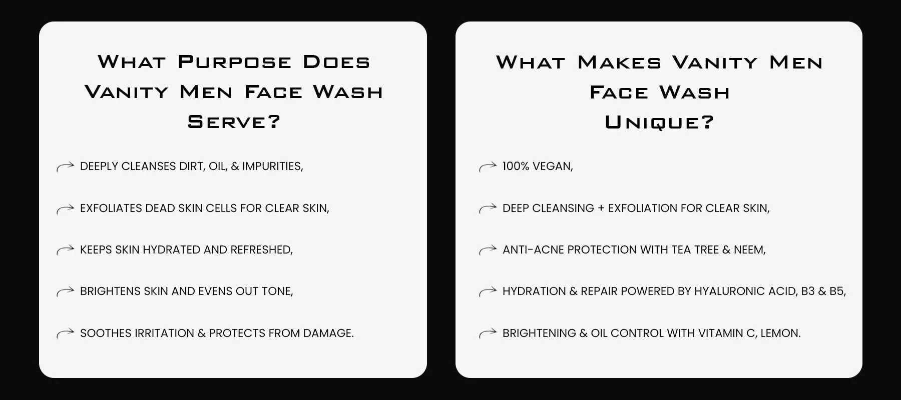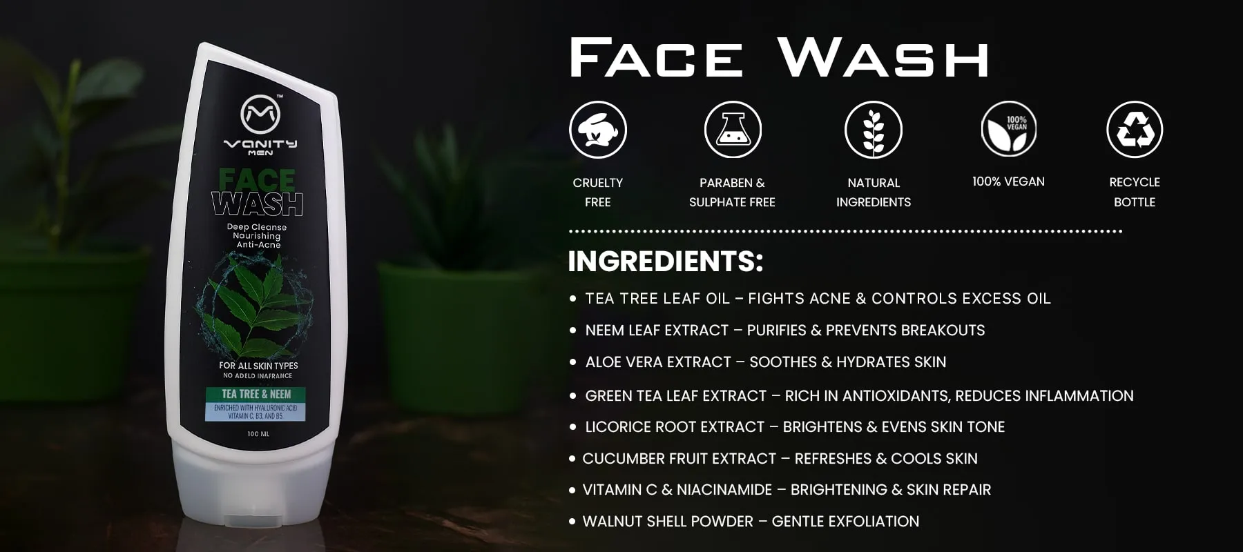 Give your skin the care it deserves with Vanity Men Face Wash – a powerful blend of natural extracts and vitamins designed to deeply cleanse, refresh, and energize your skin. Infused with Tea Tree, Aloe Vera, Licorice, and Cucumber, it helps fight impurities, excess oil, and dullness while keeping your skin hydrated and healthy. Perfect for daily use, it leaves your face clean, smooth, and revitalized without stripping away natural moisture.